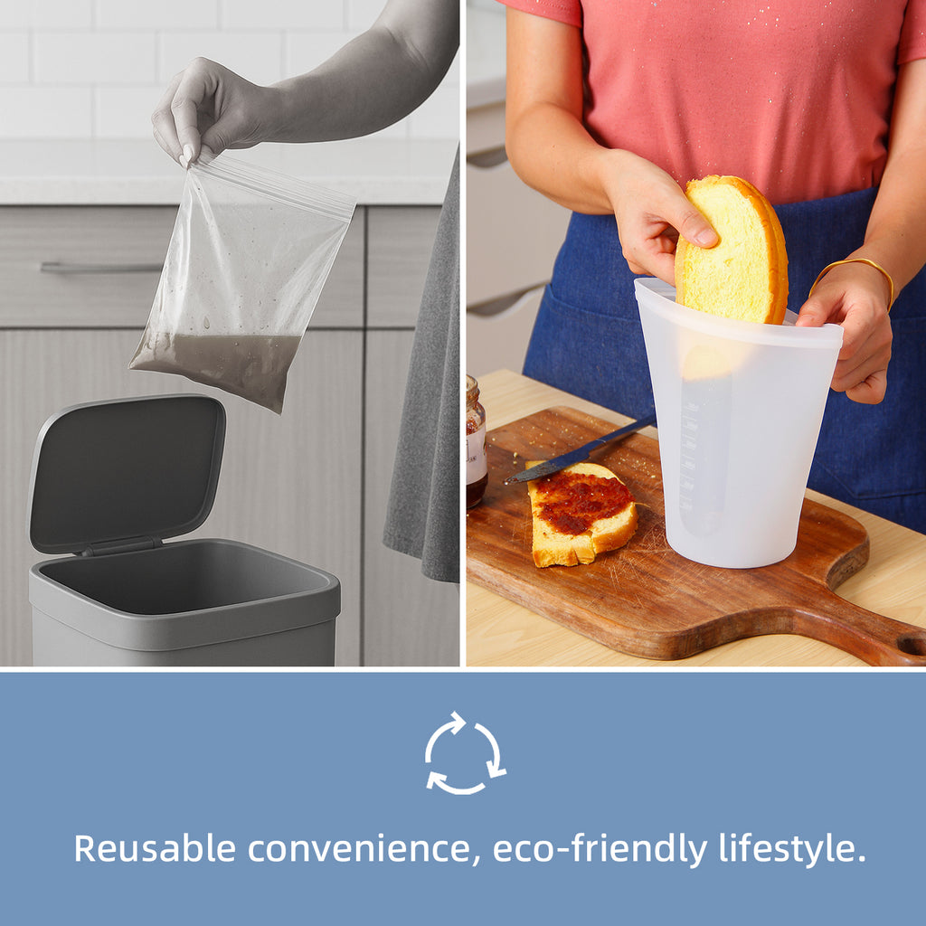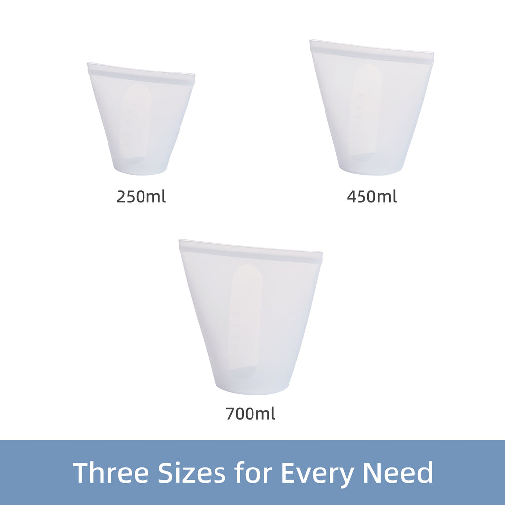 - THOUGHTFUL & ECONOMICAL Includes 1x 250ml, 1x 450ml, and 1x 700ml reusable silicone bag to meet all your storage needs In addition, a silicone bag can reduce up to 300 disposable plastic bags annually, helping to create a waste free and environmentally friendly world