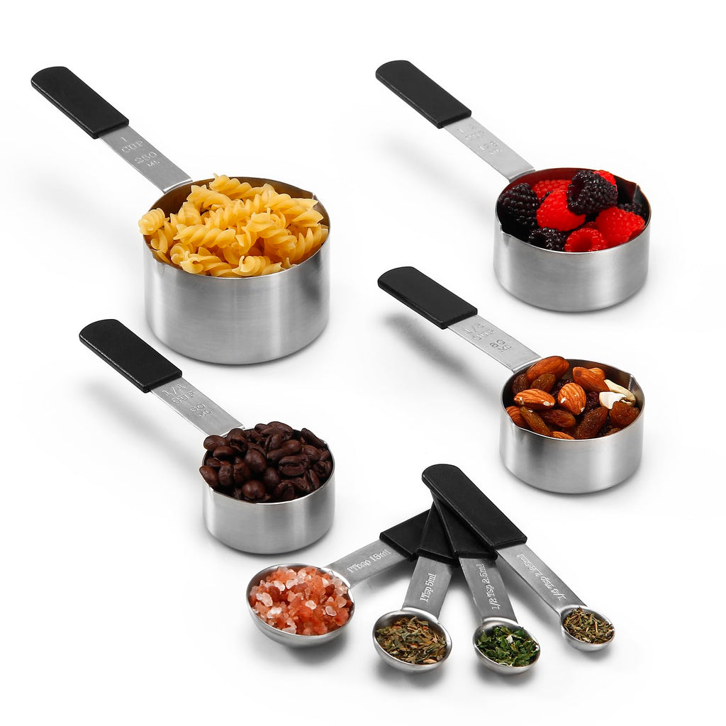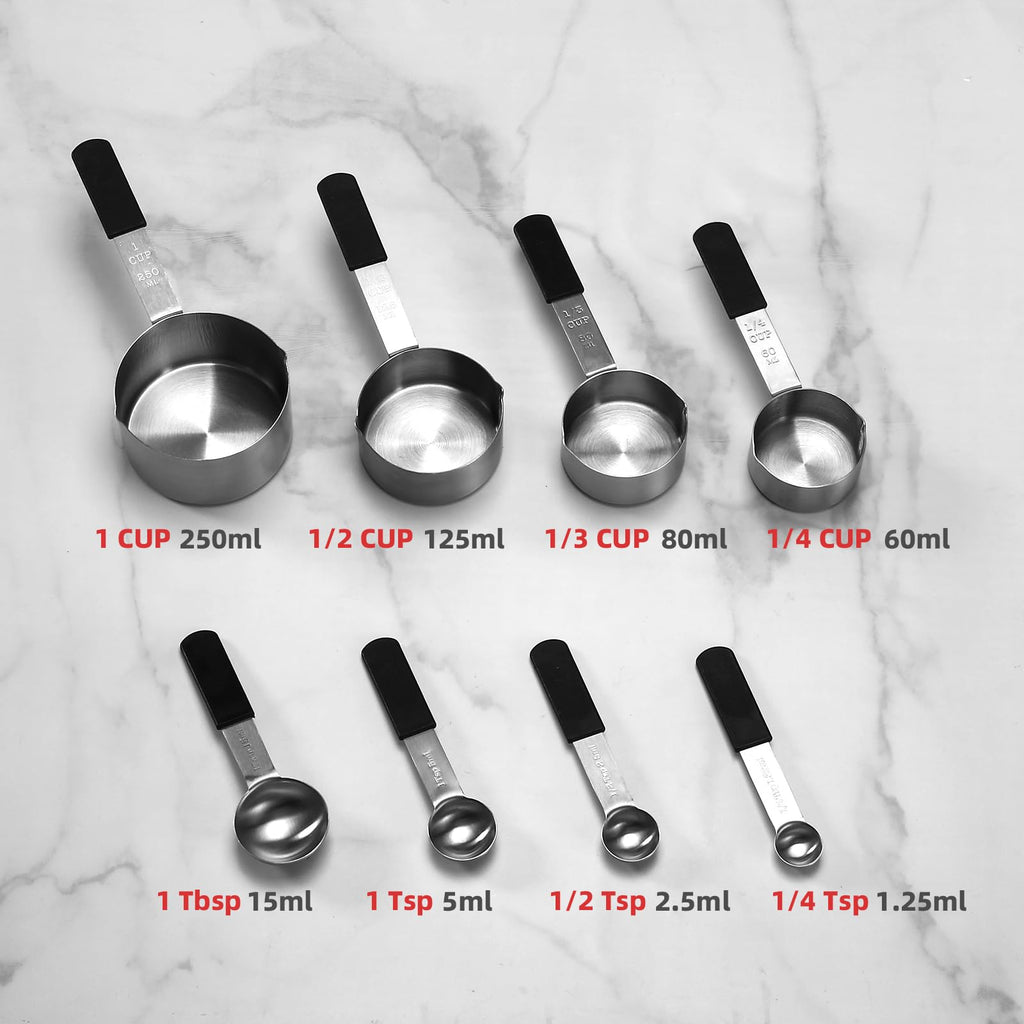 🔢 All-in-One Precision Set – Includes 1 Cup, 1/2 Cup, 1/3 Cup, 1/4 Cup, 1 Tbsp, 1 Tsp, 1/2 Tsp, and 1/4 Tsp – ideal for baking, cooking, sauces, or coffee ☕. Accurate measuring for every recipe from home meals to gourmet desserts 🍰.