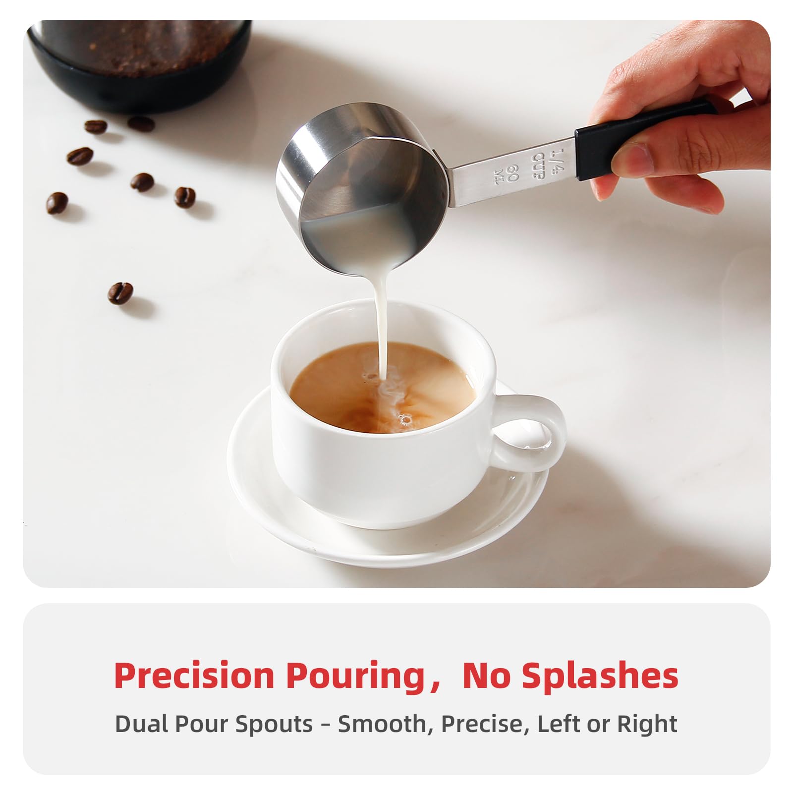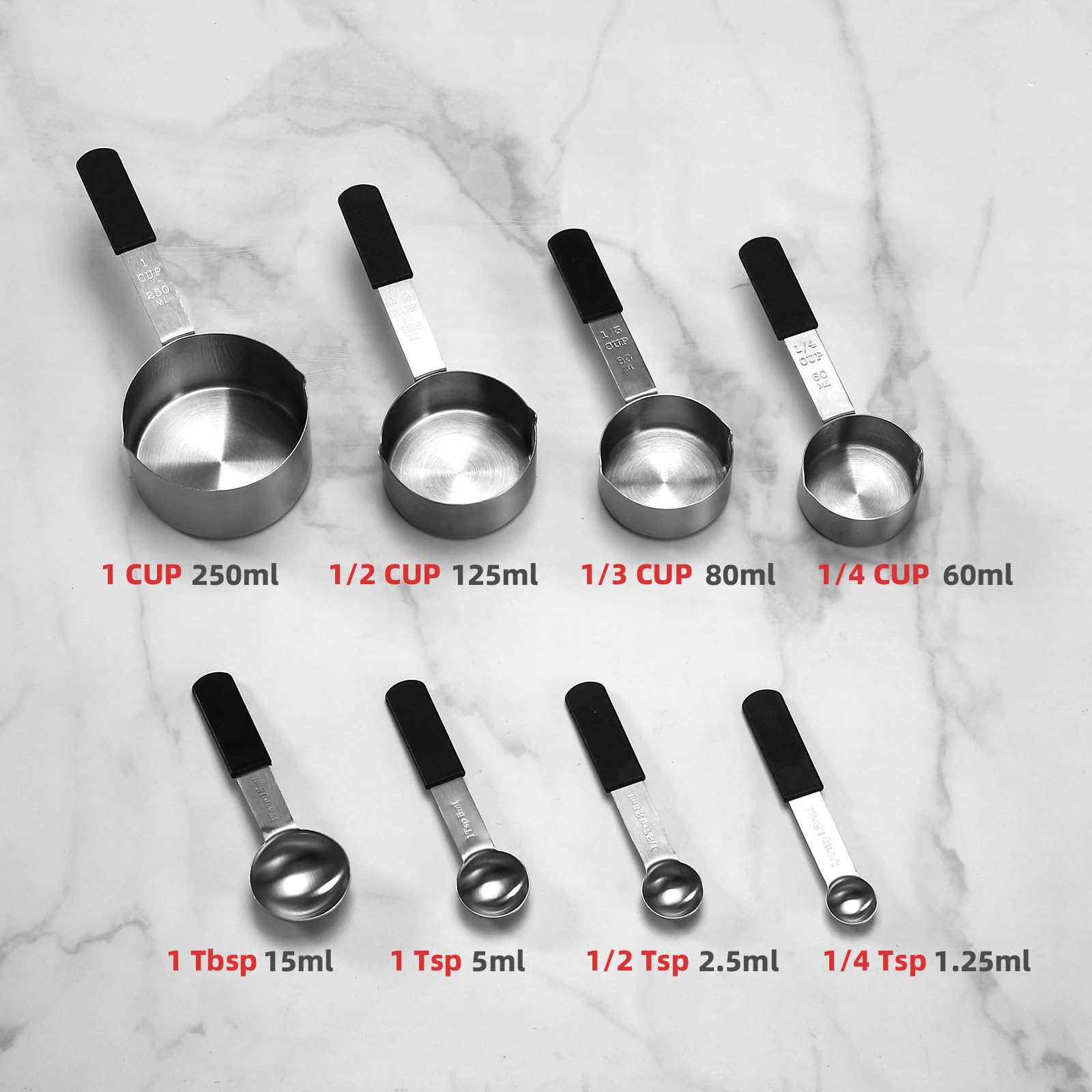 - 🔢 All-in-One Precision Set – Includes 1 Cup, 1/2 Cup, 1/3 Cup, 1/4 Cup, 1 Tbsp, 1 Tsp, 1/2 Tsp, and 1/4 Tsp – ideal for baking, cooking, sauces, or coffee ☕. Accurate measuring for every recipe from home meals to gourmet desserts 🍰.